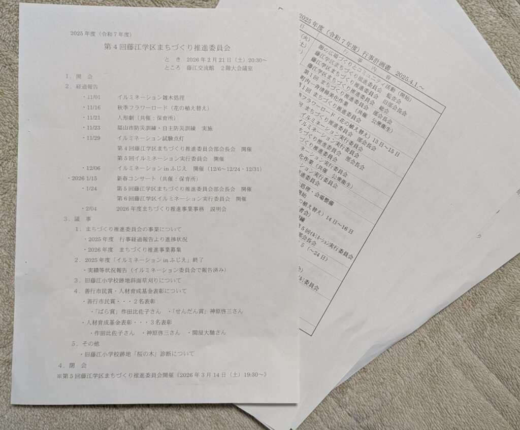 まちづくり推進委員会が開催されました 2026-02-21 最終更新日時 : 2026-03-06 まちづくり推進委員会 2月21日(土)20時30分から藤江交流館にて第4回まちづくり推進委員会の会議が開かれました。 以下の内容についての報告がありました。 行事経過報告 まちづくり推進事業募集 イルミネーションinふじえ 終了/実績等状況報告 旧藤江小学校跡地斜面草刈り作業報告 善行市民賞・人材育成基金表彰 旧藤江小学校跡地「桜の木」診断